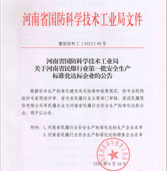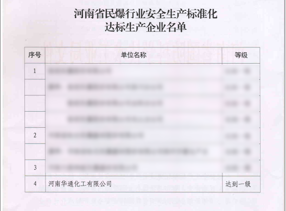 近日,河南省国防科学技术工业局发布《关于河南省民爆行业第一批安全生产标准化达标企业的公告》文件,河南华通化工有限公司被评为河南省民爆行业安全生产标准化一级达标企业。
